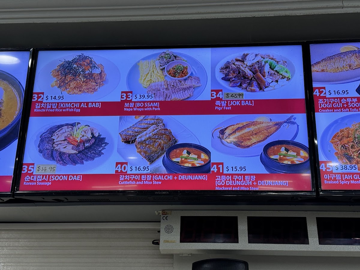 The menu also lists well-known Korean main dishes such as Bibimbob, Yook Gae Jang (spicy beef soup), Osam Bul Go Gi, Pork Tonkatsu, Mandoo Guk (dumpling soup), Tteok-Bokki (spicy rice cakes), Japchae, Korean-style Fried Pork Dumplings, and Short Ribs. Additionally, some Korean-Chinese items like Sweet and Sour Pork, Orange Chicken, and Jjampong (seafood noodle soup) are available.